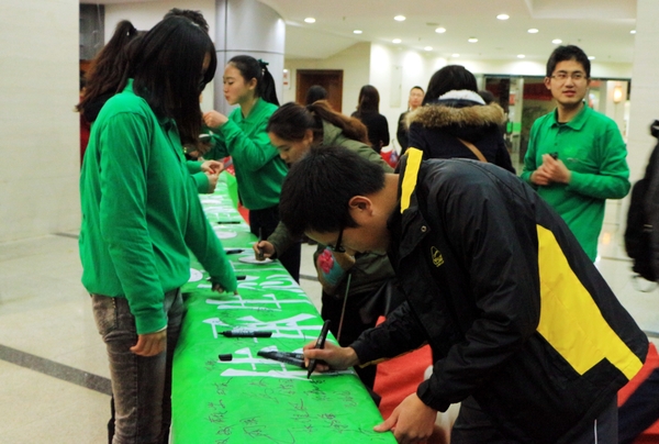 場內氣氛熱烈,場外依舊火爆。我校12名環保部“千名青年環境友好使者”專門設置了“傳承生態行為,共建美麗家園”的綠色生態簽名橫幅,用“低碳羅盤”向到場的師生現場講解“碳足跡計量方法”和生態行為的有關知識。這是對黨的十八大生態愿景的積極響應,也是我校青年大學生承擔生態文明建設責任的呈現。