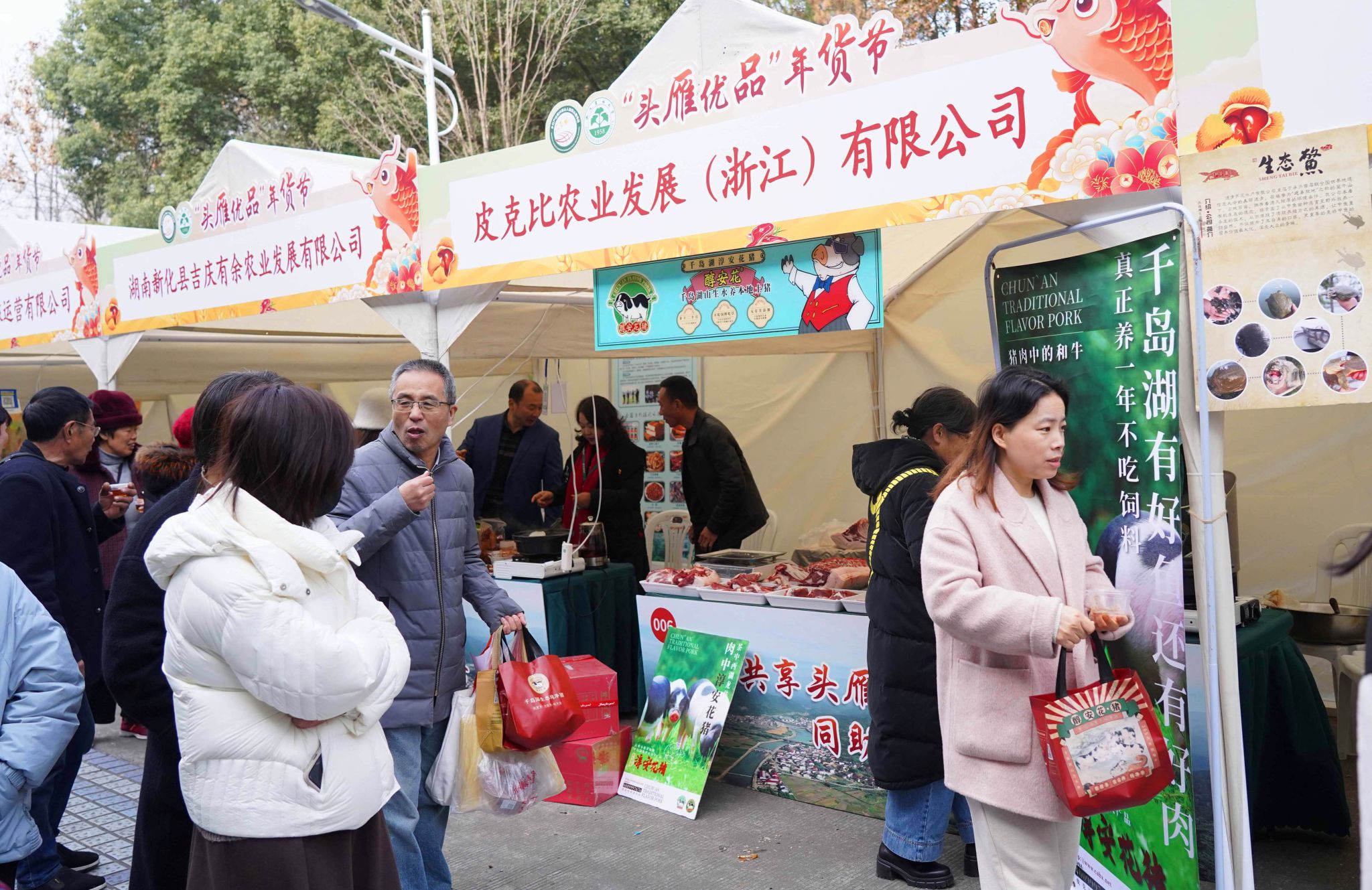 上午11時,在一場隆重的開集儀式后,為期兩天的浙江農林大學“頭雁優品”年貨節拉開帷幕。開幕式上,由主持人扮演的穿越時空的“蘇東坡”,帶來精彩的“頭雁興農夢”舞臺劇,用古今結合的方式生動展現了鄉村蝶變的壯麗畫卷。舞臺下,年貨節正式開啟,現場人頭攢動,各類互動活動精彩紛呈,現場品嘗、體驗制作、選購打包,線上各大網絡平臺和直播間也同步直播售賣,數千師生、市民共同參與到這場年貨盛宴中。