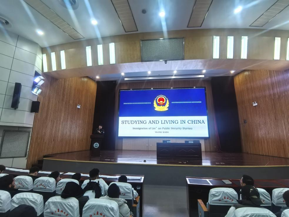 臨安區分局警官王益龍為全體國際學生做案例警示講座。他通報了杭州近期發生的違法犯罪典型案例,結合我校國際學生實際,從治安管理、出入境、禁毒、交通、宗教等方面為國際學生詳細闡述了中國的具體法律條款,提醒國際學生在華留學期間必須遵守中國的法律法規,增強法律意識,絕不以身試法,做遵紀守法的國際學子典范。