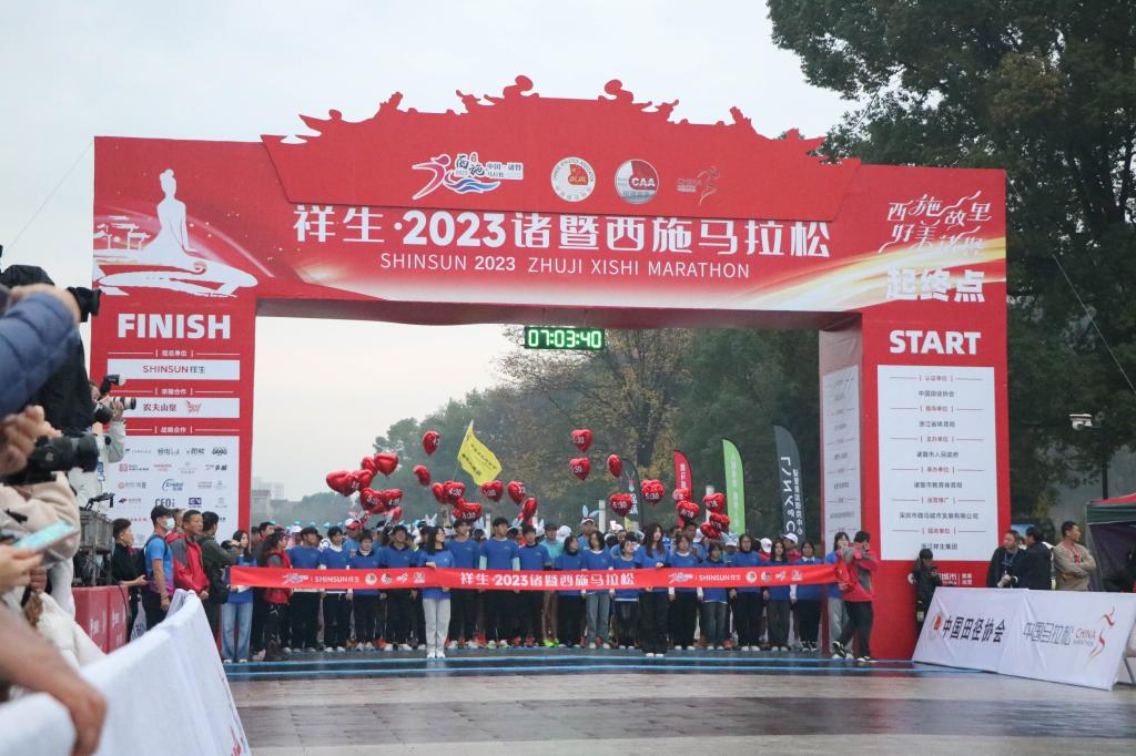 12月10日,2023諸暨西施馬拉松在城市廣場鳴笛開賽。來自國內外的15000名選手齊聚諸暨,用奔跑感受運動風采。
