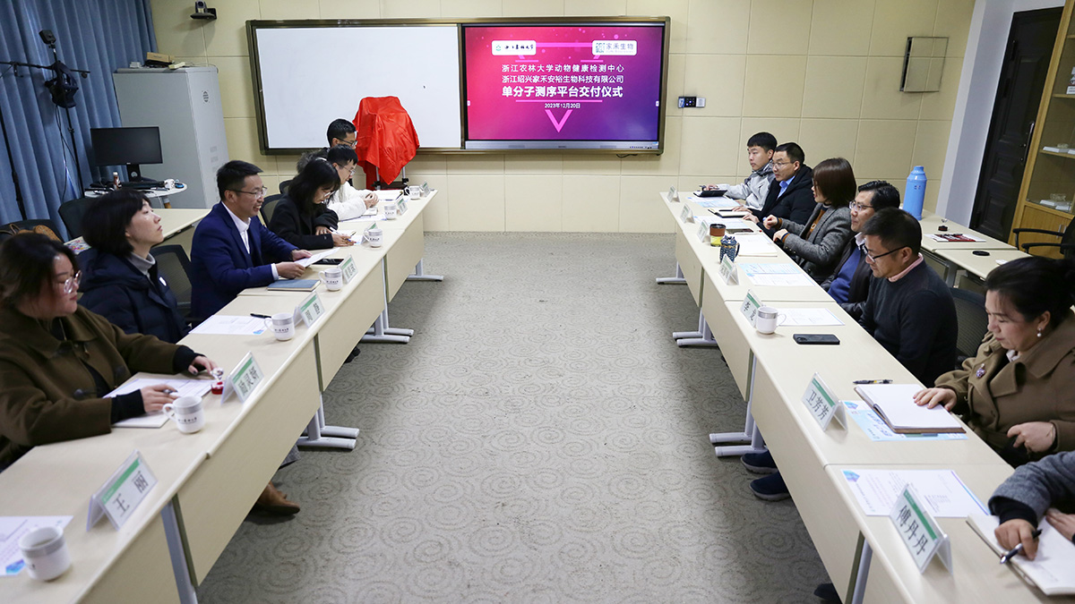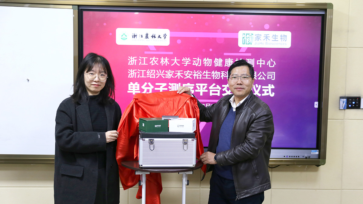 12月20日,動物健康檢測中心與浙江紹興家禾安裕生物科技有限公司簽署單分子測序平臺合作協議,并舉行了交付儀式。校黨委委員、動科動醫學院院長宋厚輝,浙江紹興家禾安裕生物科技有限公司總經理鄭佳佳、市場總監李沛東,以及雙方骨干成員出席交付儀式。儀式由浙江紹興家禾安裕生物科技有限公司總裁董恩球主持。