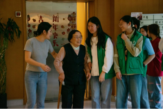 在長者們午睡結束后,依次將他們攙扶進入提前布置好的演出場地。