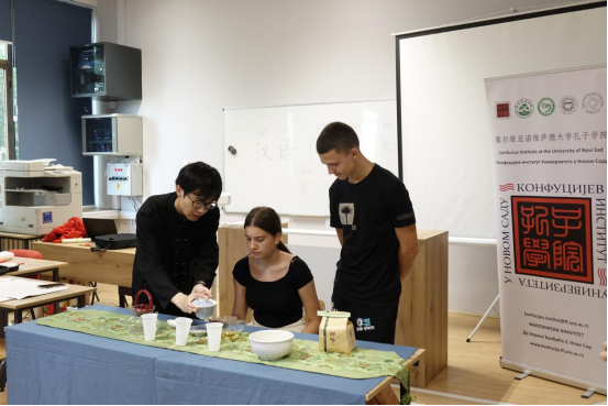 體驗課開始前,Petro Kuzmjak中學學生表演了中文拍手歌和數字朗讀,歡迎諾大孔院老師的到來。體驗課展示了中國傳統蓋碗茶藝,講解了中國茶文化中的“天人合一”和“公平正義”的哲學思想,讓學生了解中國茶文化的內涵和精髓。學生在老師的指導下現場完成“中塞友誼萬古長青”的書法作品。全體師生合唱《友誼天長地久》作為結尾,表達了中塞兩國人民之間的深厚友誼和美好愿景。
